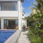 This Beachfront Home in Hacienda Iguana has 5 bedrooms and 5 bathrooms and sits right on the world-famous Playa Colorado beach. The meticulously landscaped entryway and paved circular driveway take you to the stunning entrance of the home. Β The oversized facade contains locally sourced stone and tile, giving the home the ultimate “wow” factor. Β The home’s interior also contains locally sourced wood, stone, tile, and concrete to create a pleasing bespoke aesthetic. Manicured gardens and walkways encompass the exterior of the property.