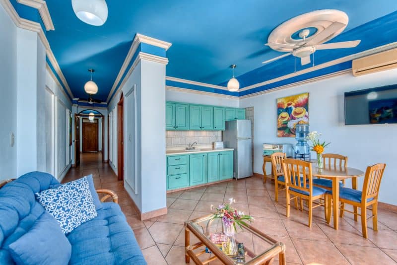 This Beachfront Oceanview Condo in Town is located on the fourth floor of Casa Marina, the only five-story building in town. Β The building has 24/7 security, an elevator, a backup generator, backup water tanks, and on-site property management. Β The spacious 2 bedrooms | 2 bathrooms apartment is located on the fourth floor and has breathtaking views of the bay of San Juan del Sur and the surrounding area. Β The unit opens up to a long hallway that provides access to both bedrooms, the kitchen, and the living area. The unit can be configured to rent the second bedroom independently, creating two rental units, or a rental unit and owner’s unit.