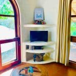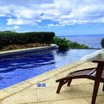 Returning downstairs and out to the expansive ocean view patio, youβll find the master bedroom that comes fully equipped with a flat-screen TV, his and her wardrobe area, a safe and a double set of wood doors that open to the covered terrace.