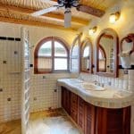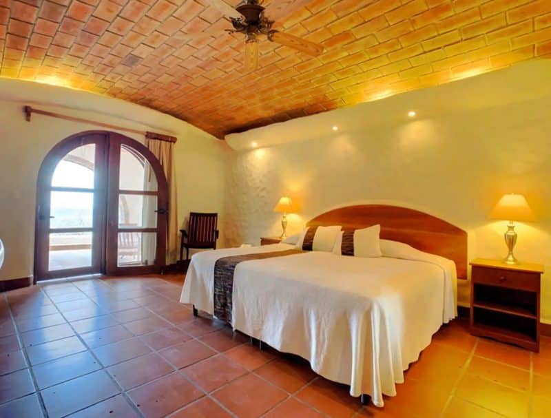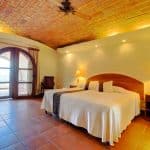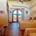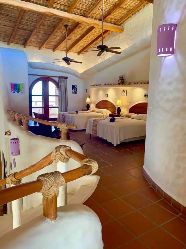 Taking the staircase upstairs, youβll arrive at the 2nd bedroom with two queen beds, a private full bathroom with double sinks, stone floors and vanities, and an open shower. Off of the 2nd bedroom is the expansive ocean view balcony, perfect for taking in the scenery across the Bay of San Juan del Sur.