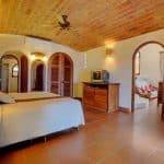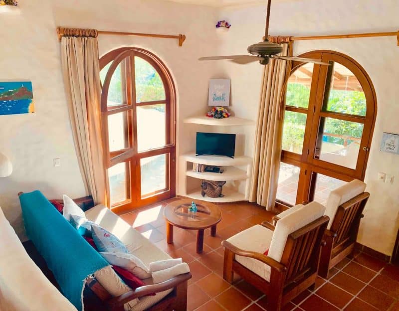 Upon entry to Casa de Los Osos, youβll immediately notice the open floor plan with a fully equipped kitchen, a fully furnished living room with a futon, a dining area, and an entertainment center. A full bathroom is also located on the main level.Β The 20+ foot high cane-lined ceilings are delightful and facilitate cross ventilation throughout the home.