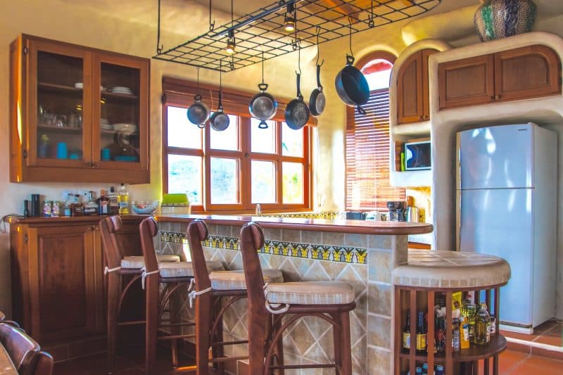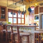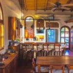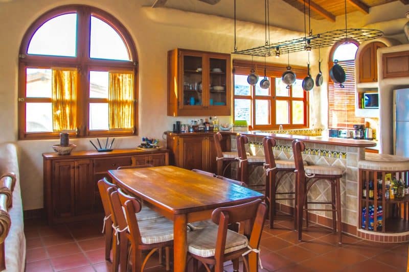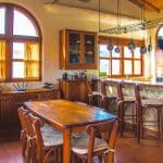 The main level of Casa Nuevo Amanecer at Pelican Eyes is a full floor open plan living area, with majestic bay views straight ahead. The fully equipped kitchen flows to the dining room, and into the living room with a queen pullout sofa and additional seating. There is also a full bathroom on this level for guests as well as a utility room with a washer and dryer with plenty of storage. The tall cane ceilings, besides looking spectacular, help with cooling and cross ventilation.