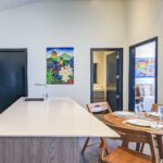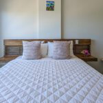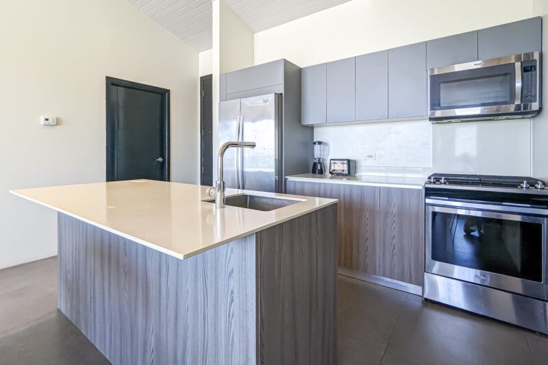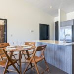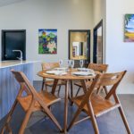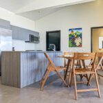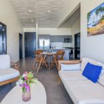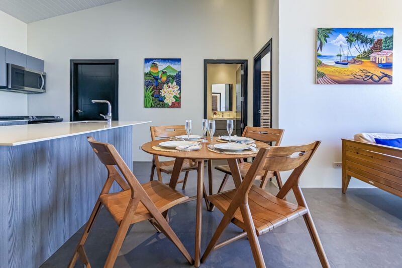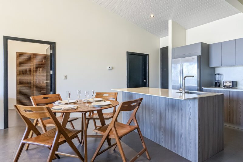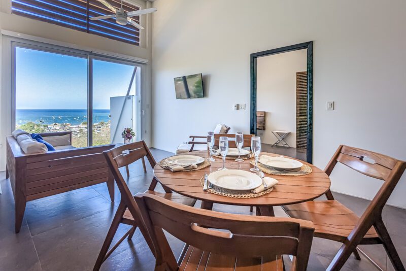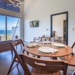 As you step inside, you’ll find aΒ kitchen that’s bothΒ sleek and functional, completeΒ with a large island, quartz countertops, plenty of cabinets, and top-notch stainless steel appliances, including a dishwasher.Β The dining area, with its cute circular table for four, flows seamlessly into the cozy living room, where you’llΒ be treatedΒ to stunning views of the Pacific Ocean. The open-plan design and central air conditioning create a welcoming space forΒ both chilling out and entertaining friends at this Condo in La Santa Maria.