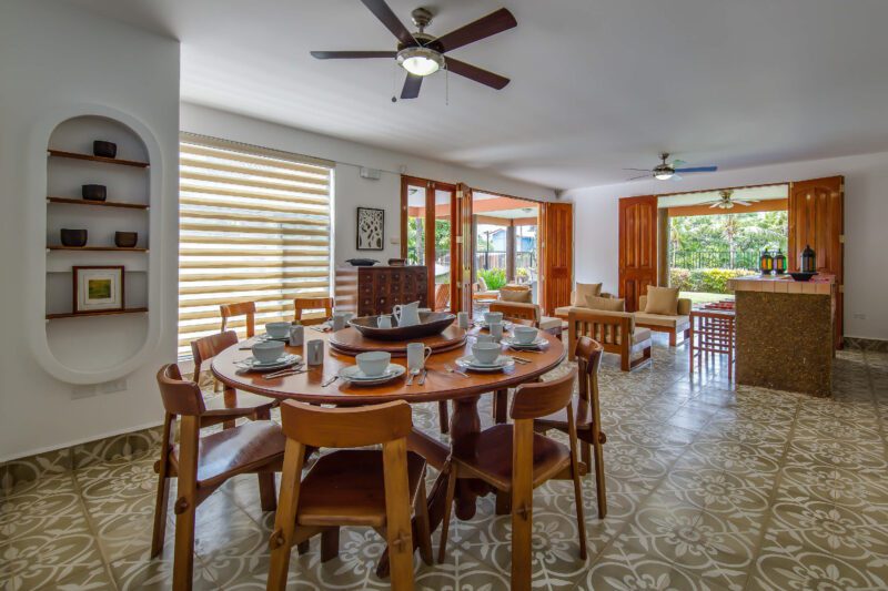 This grand estate, far from ordinary, unfolds in a series of luxurious spaces. The primary villa, a masterpiece in its own right, houses four splendid bedrooms, each featuring its climate oasis with air conditioning and exclusive dressing rooms. Culinary dreams awaken in a gourmet kitchen, and life’s moments find their stage on patios that wrap around the home, adorned with handcrafted furniture and inviting hammocks for leisurely afternoons.