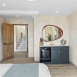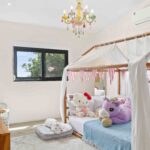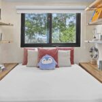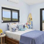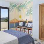 Upstairs, the Luxury 9 Acre Oceanview Retreat has two en-suite bedrooms—each with AC, bathrooms, and generous closet space—promising comfort and privacy. A wide hallway bathed in natural light connects the rooms and opens to a covered balcony for al fresco lounging. Nearby, a custom library nook with a guest bed provides a cozy haven for story time or sleepovers.