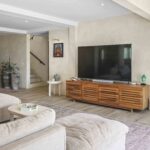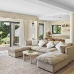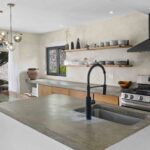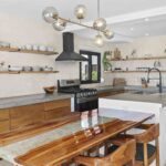Inside the home, a sunlit foyer and sliding glass doors frame the ocean view while a warm, neutral palette sets an inviting tone. The gourmet kitchen—featuring handcrafted cabinetry, modern appliances, concrete countertops, and a custom dining table—flows seamlessly into the living spaces. Reimagined in 2022, the home radiates contemporary luxury with every carefully chosen detail.
