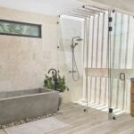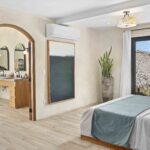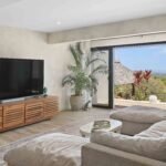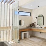 The main-level primary suite is a sanctuary of space and calm, large enough for a king-sized bed. A wine minibar and coffee station anchor a corner, while a spa-like ensuite offers a sun shower, tub, and dual vanities. A vast walk-in closet completes this private retreat. Step directly from the owner’s suite to the pool via a sliding glass door, where you can ascend a spiral staircase to your stargazing and yoga lookout.