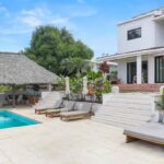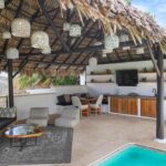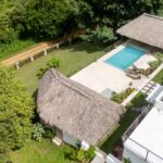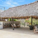 The outside of the Luxury 9 Acre Oceanview Retreat is nothing short of spectacular. A sun deck, tanning chairs, and a lounging bed frame a sparkling pool with a shallow end ideal for little ones. Dual palapas shade dining and workspaces, complemented by a wet sink, outdoor TV, and refrigerators—perfect for effortless entertaining. Mango, lime, and other flora enhance the landscape, creating a private tropical oasis.