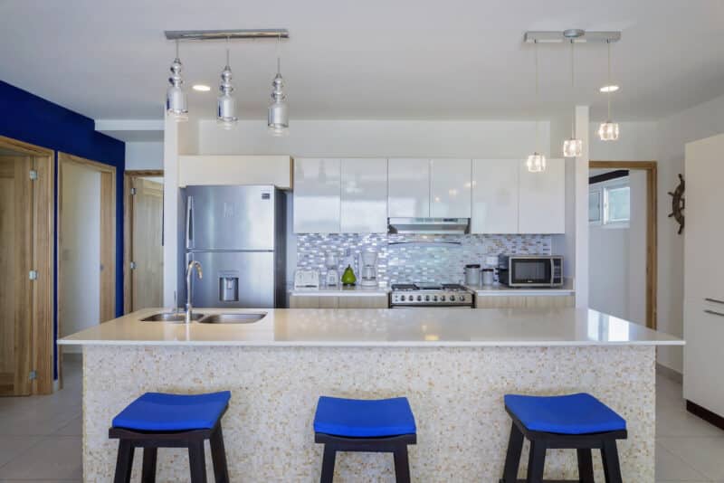 This Luxury Ocean View Apartment comes fully furnished and 100% turnkey. The unit has two dedicated parking spaces by the entrance of the building, and an elevator is available for heavy lifts with luggage or groceries. The apartment building has a large ocean view pool and a common area to take a dip if you don’t feel like traveling to the nearby beaches.