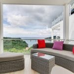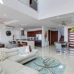 The spacious living room and kitchen area blend seamlessly with the exterior deck via sliding glass PVC doors.Β Β The infinity edge pool is surrounded by non-heating tile and various areas for lounging β whether sitting under the shade on the large sofa or having a cocktail at the high table on the edge of the deck.