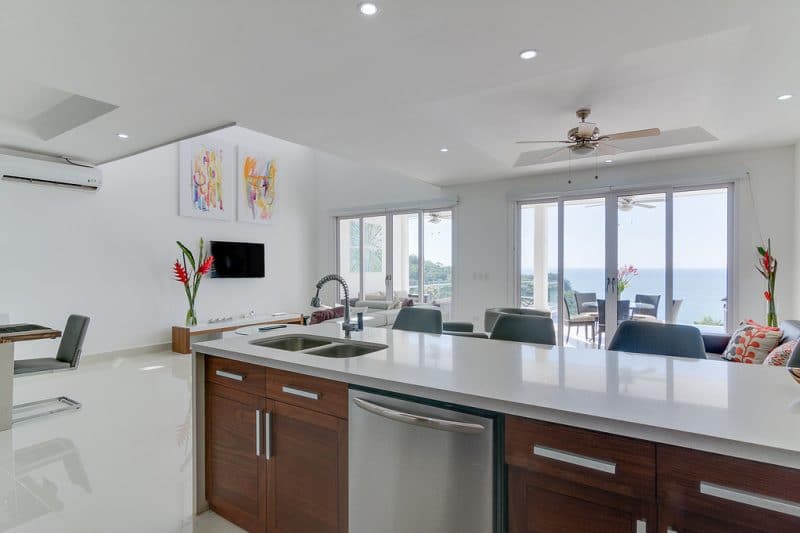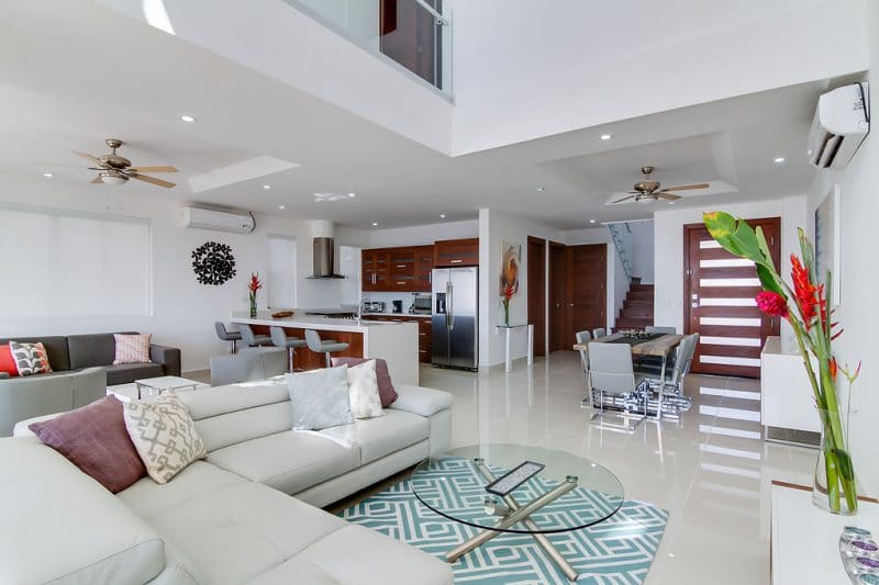 This 3 bedrooms / 3 bathrooms two-level home has approximately 2,600 sq ft of interior space and over 1,000 sq ft of covered exterior space, providing ample area for entertaining family and guest.Β Β Two dedicated parking spots sit directly in front of the covered entryway before arriving at the oversized tropical hardwood front door with keypad entry.Β Β Breathtaking ocean views greet you as soon as you walkthrough the front door and enter the sunlit filled open living area which boast 22 foot ceilings and elegant imported tile.Β
