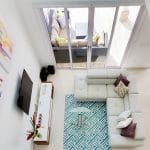 Outside of the living & kitchen area, the first floor also contains a bedroom and full bathroom with two accesses β one directly from the bedroom and one from the living area for guest.Β Β There is also a storage area located underneath the stairwell.Β