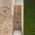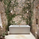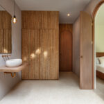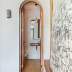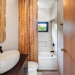 There is a bedroom off the living room with a full ensuite bathroom. An additional half bath is found off the living room. The primary bedroom faces a green, zen-like outdoor space. The primary bathroom is an indoor/outdoor style, so you can shower under the stars but in complete privacy. There is a walk-in closet for accommodating your clothes and storage needs.