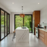 The kitchen has an equally stunning view to the outside and designer touches to take note of. There is a quartz island with waterfall edges, high-end appliances, and designer lighting.