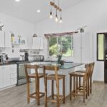 A kitchen sits at the other end of the room with an island large enough to eat at. The kitchen has plenty of counter space for food prep. The over-island lighting gives the home a cozy feeling