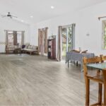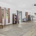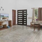 There is an oversized dining room/living room that greets you when you first enter. There is enough room for your full-sized couch and a dining table. The whole room is light, bright, and has a modern vibe. Wood-like tile floors flow around the entire home, giving continuity to the space. Off the living area, find a walk-in laundry room/mud room. This space is big enough to serve as not only a laundry area but storage space.