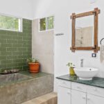 The bathroom has plenty of space too, including a not-to-be-overlooked bathtub and some stunning green tile.