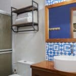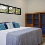 The quaint home has everything you need for a soft landing in Nicaragua. The house is open-concept with a living room, kitchen, and dining room. The high ceiling and large windows make the home feel larger than it is. The blue tiled kitchen backsplash and painted blue accent wall give the house a fun and fresh personality.