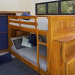 The bedrooms are ample in size. One bedroom has a custom-built queen bunk bed with a third pull-out queen trundle on the bottom, meaning this room can sleep six if needed. There is a built-in closet in this room and an ensuite bathroom. The master bedroom has a king-sized bed. There is a built-in closet for storage and an ensuite bathroom.