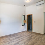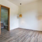 A paneled kitchen door reveals a pantry-laundry combo. The home’s solar system is housed here, with a back door leading outside.