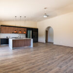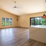 The kitchen flows seamlessly into the living room. Cohesive flooring unifies the space. Large windows invite floods of natural light.