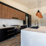 Two-tone cabinets—natural uppers, black lowers—are paired with sleek white quartz countertops. An oversized, waterfall-style island exudes modern elegance.
