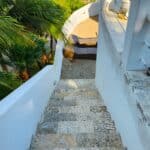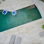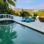 A set of stairs leads you from the patio to the second level, where you’ll find a custom in-ground pool linked by a picturesque bridge walkway. The pool overlooks the beach and the vibrant town of San Juan del Sur. The opposite stairs lead you up to the main bedroom, with sliding doors open to a serene, private sitting area. The pool is surrounded by generous terrace spaces, perfect for sunbathing or evening lounging as you watch the town’s lights flicker below.