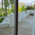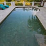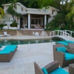 The heart of the home is an enormous living room centered around floor-to-ceiling doors stretching the room’s length, opening out to the patio and pool. The dining area is a few steps above the living room, adjacent to a spacious kitchen featuring a convenient serving window. The master bedroom with a private bathroom can also be accessed from this level. A separate entrance from the back leads to the staff quarters and their respective bathrooms.