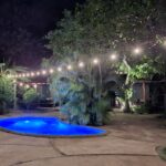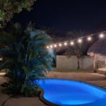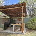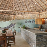On the far side of the pool is a huge outdoor kitchen and dining area housed in a large palapa. There is a dining table for eight. A huge island for food prep and lounging around, as well as plenty of additional counter space and storage. There is ample room to make the simplest or most elaborate meal. Hammocks hang on the outside edges of the palapa, offering up an inviting place to relax.