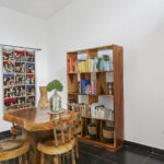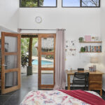The home itself has four bedrooms, all with en-suite bathrooms. The bedrooms are divided between two different buildings. The primary suite includes an indoor dining area, a lounging/TV room, and the bedroom itself. This bedroom and living area feature sliding doors that lead into a separate fenced yard, perfect for your furry friends.