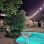 Everything inside the walls is lushly landscaped with plenty of palms and greenery, giving it a tropical oasis feeling. The buildings and spaces within the walls are connected by concrete walkways and outdoor patios, giving the area a very cohesive look and feel. Outdoor lighting has been installed throughout, so the spaces can be used day or night.