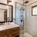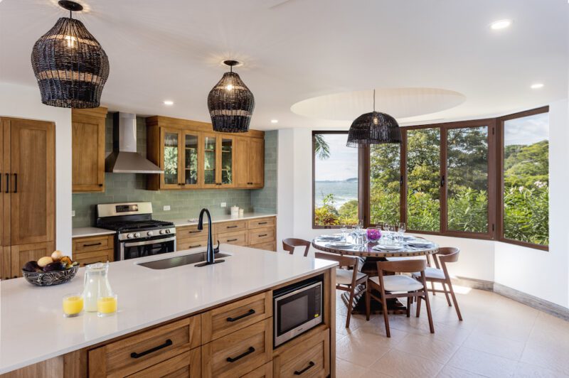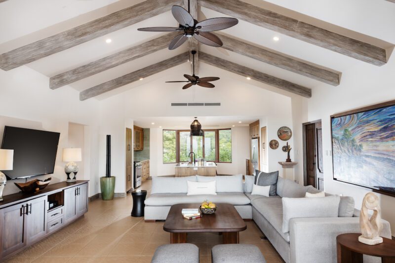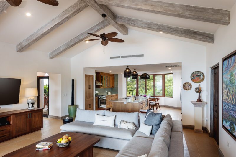 As you step into Villa Rosada, you are greeted by a living space that welcomes you with comfort and aesthetic excellence. Each room is a vantage point, offering panoramic ocean views, ensuring the majestic coastline is a constant backdrop to your daily life. The luxury home’s design integrates indoor elegance with the allure of the outdoors, featuring multiple wooden terraces that are perfect for yoga, alfresco dining, or basking in the sun while being caressed by the ocean breeze.